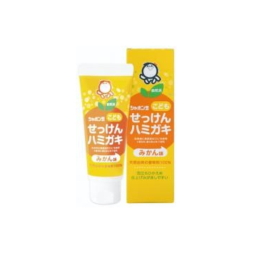天然由来の香味料100%みかん味のこども向けせっけんはみがきです。