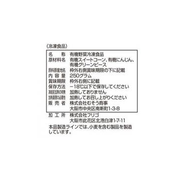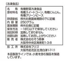 農薬や化学肥料を使用せずに育てられたコーン、にんじん、グリーンピースを急速冷凍。